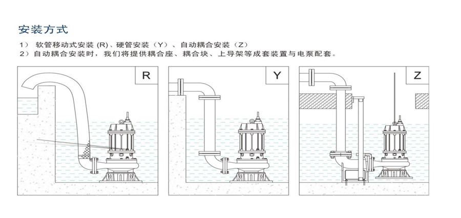 7.可根据用户需要配备双导轨自动耦合安装系统,它给安装、维修带来更大方便,人可不必为此而进入污水坑。